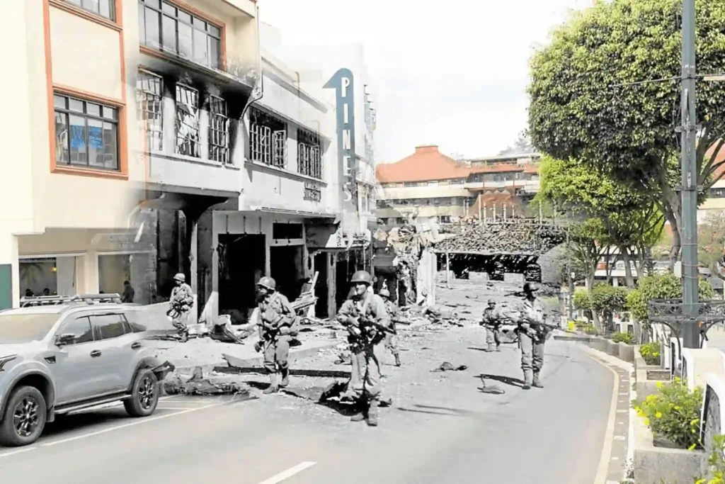 Photographer Neil Clark Ongchangco used digital media to blend an archival photo of American soldiers from Baguio’s 1945 liberation with a modern image of the city’s business district. Photo: Inquirer